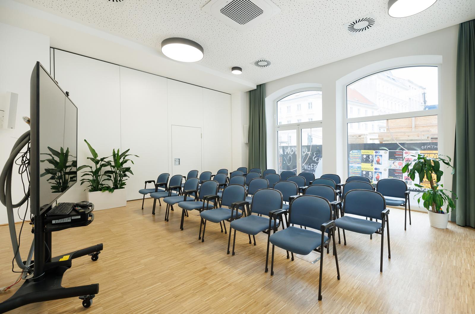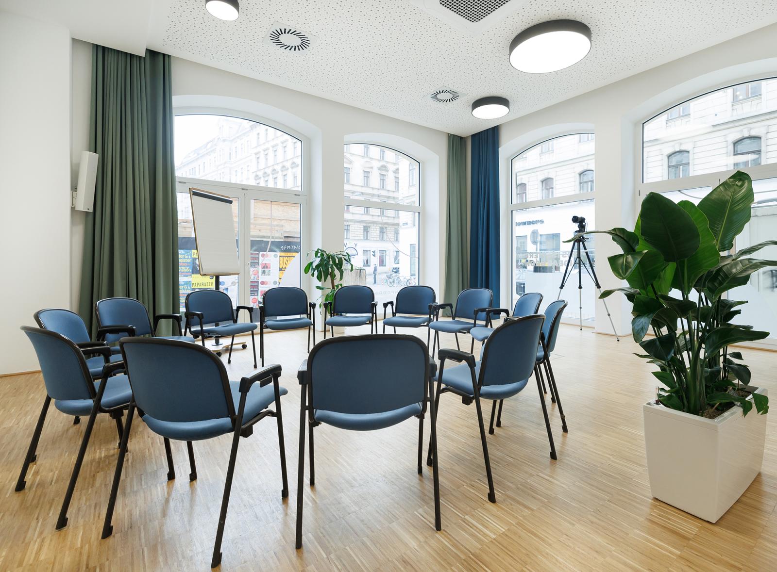 Dieser Raum ist der ideale Ort für Meetings und Workshops bis zu 30 Personen. Umgeben von hohen Fenstern, bietet er reichlich natürliches Licht.